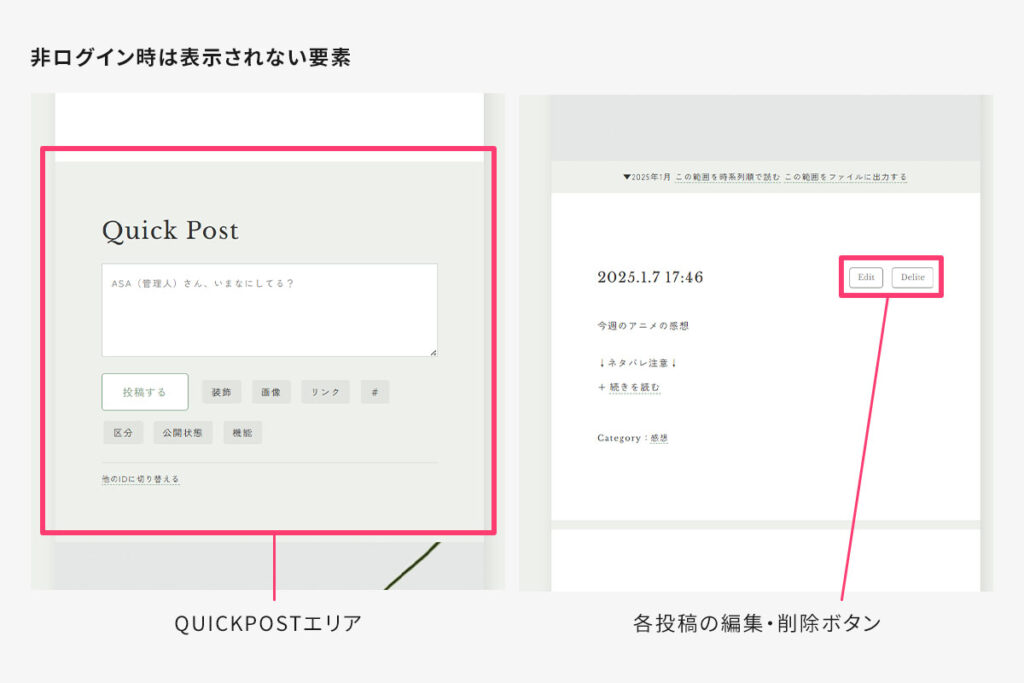 「QUICKPOST」を「ログインしている際にのみ表示する」に設定する必要があります。設定方法はこちら。